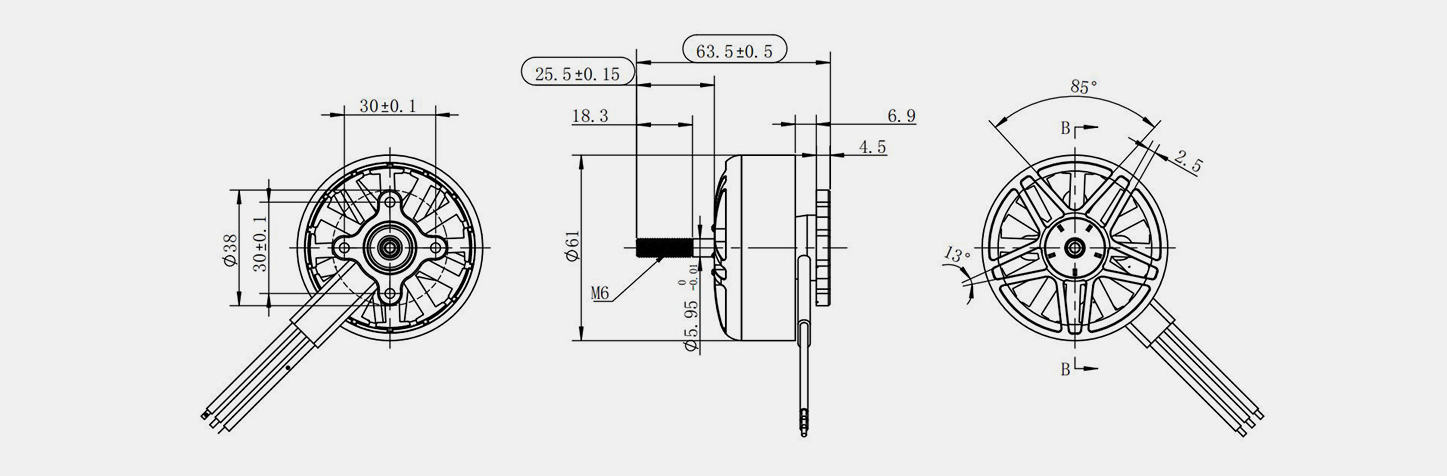 | Max. P (W) | Spänning (V) | Max. jag. (A) | KV | Ström utan belastning (A) | Motstånd (mΩ) | polacker | Motor Dim. (mm) | Stator Dim. (mm) | Montering (mm) | N.W. (g) | Prop. (tum) | ||||||||||||||