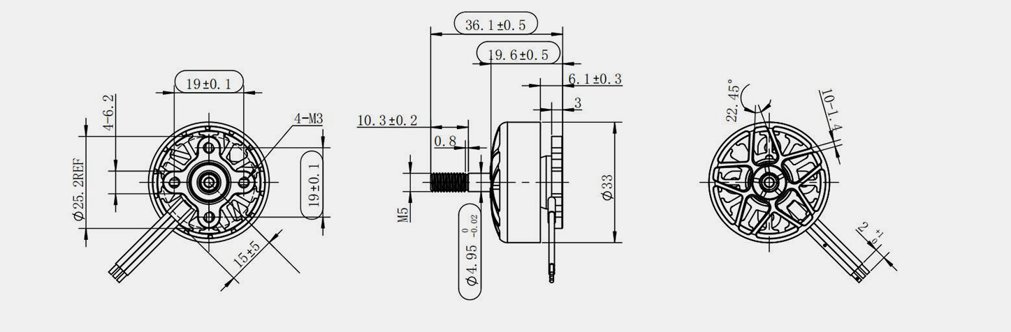 | Max. P (W) | Spänning (V) | Max. jag. (A) | KV | Ström utan belastning (A) | Motstånd (mΩ) | polacker | Motor Dim. (mm) | Stator Dim. (mm) | Montering (mm) | N.W. (g) | Prop. (tum) | |||||||||||||||